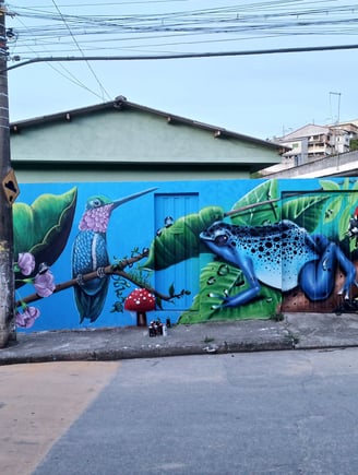 Painel finalizado no dia 05/02/24 em Salesópolis SP, uma fachada multifauna feita em parceria de Alekspunk, onde os beija flores dividem espaço com flores, insetos e uma rã.